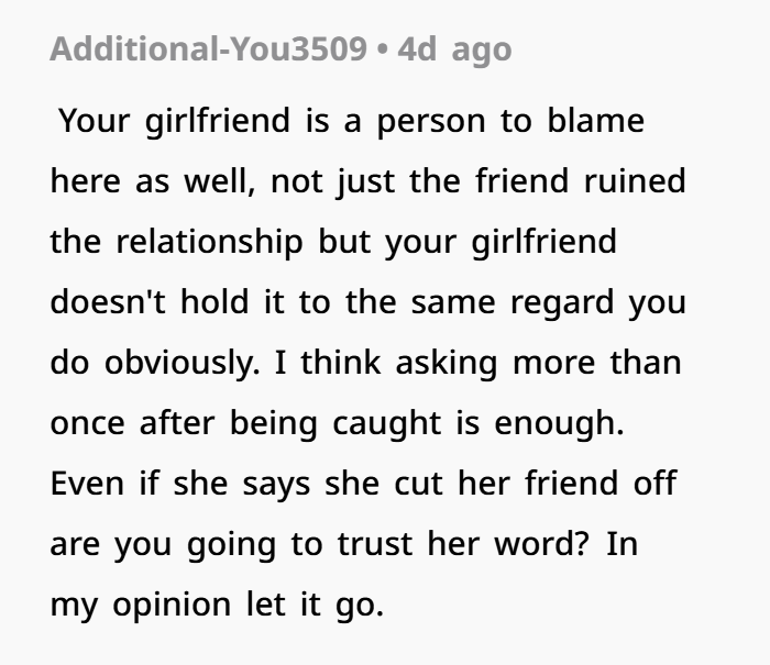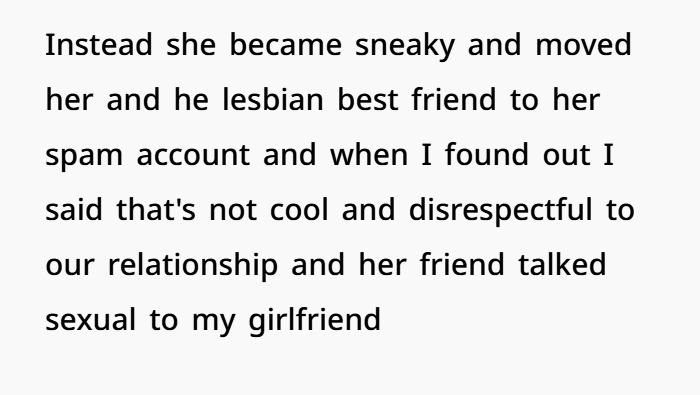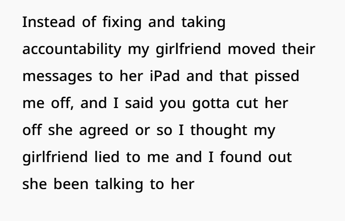 The girlfriend didn’t just continue talking to the friend. According to the story, she moved the conversations to spam accounts and private devices like an iPad. That’s important because secrecy often becomes a bigger problem than the original behavior.