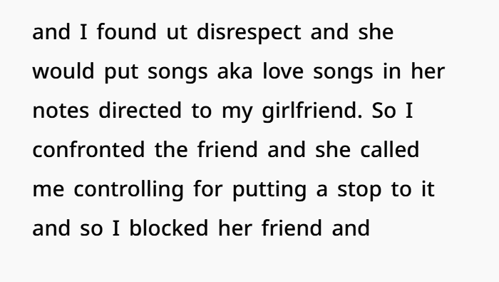 According to the story, the friend sent sexual messages and romantic signals, including love songs directed at the girlfriend. That changes the dynamic from a normal friendship into something closer to active romantic interest.