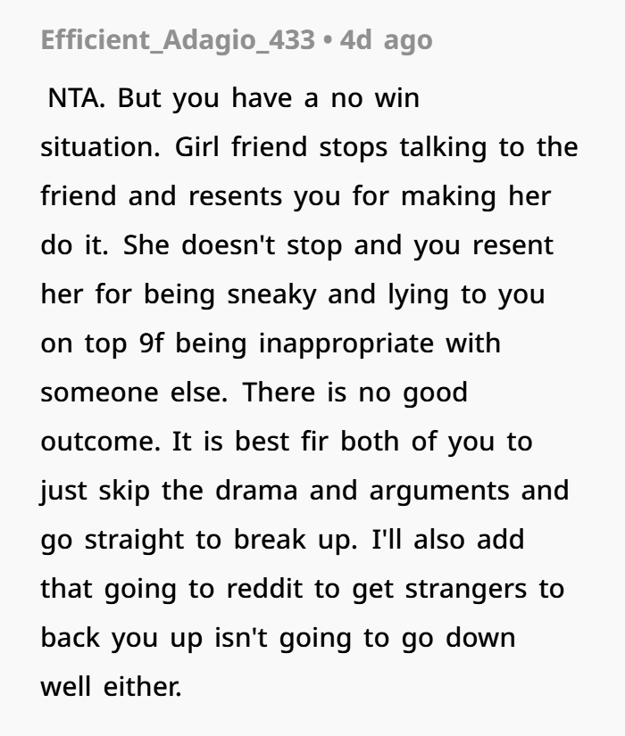 What makes the situation particularly tense here is that the girlfriend apparently continued the friendship secretly after promising to stop.