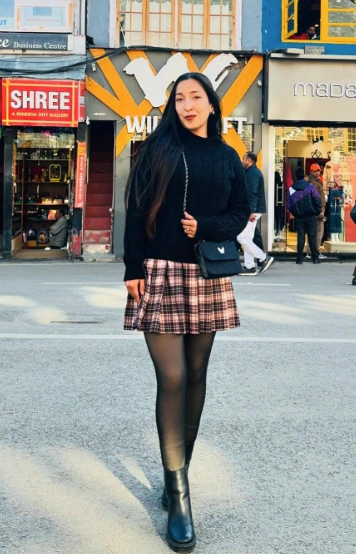 Now this one’s for the bold fashion girls! The black turtleneck keeps things cozy, while the polka dot mini skirt adds a cute and playful twist. The long black coat brings a bit of drama (in the best way), and those red loafers? Total showstoppers. Who says winter fashion has to be boring?