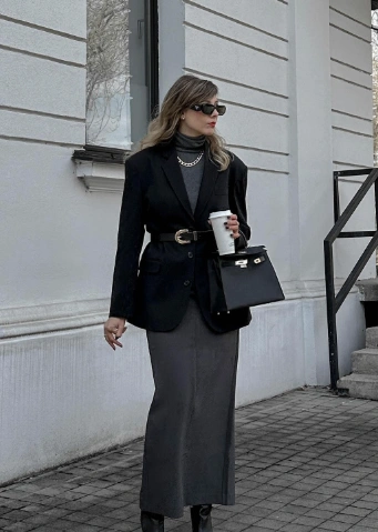 This look is giving major elegant winter outfit energy. The sleek black blazer adds a sharp, polished touch, while the cozy turtleneck sweater keeps things soft and warm underneath. The satin skirt brings that little hint of luxury — just enough shine to make you stand out without trying too hard. Add a statement necklace and knee-high boots, and boom — you’re ready for work meetings or a stylish dinner date. It’s classy, confident, and totally wearable.