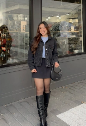 Who says winter skirt outfits can’t be cozy and stylish? This look mixes a trendy black denim jacket with a soft light blue sweater — warm, comfy, and totally cute. The black mini skirt adds that youthful, flirty touch, while the knee-high boots give you instant winter fashion girl energy. Perfect for brunch, dates, or just turning heads on a cold day.