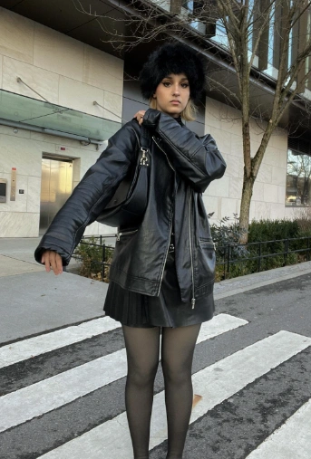 This look is giving “cool girl winter.” The black leather jacket and pleated mini skirt combo is timeless, while the opaque tights keep you warm without losing that edgy vibe. Add ankle boots and you’ve got the perfect winter street style outfit — sleek, confident, and totally effortless.
