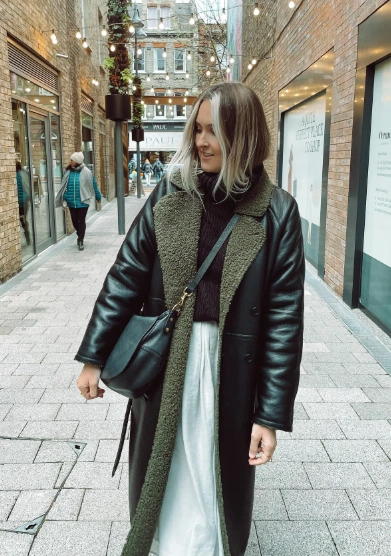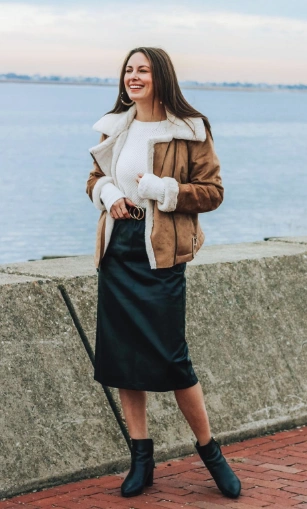 This outfit gives pure cozy luxury. The brown faux shearling jacket looks so soft and expensive (without the price tag), while the knit sweater keeps you toasty. The sleek black midi skirt brings in that elegant vibe, and the ankle boots add just the right amount of edge. A flawless winter fashion outfit that transitions from day to night like a dream.