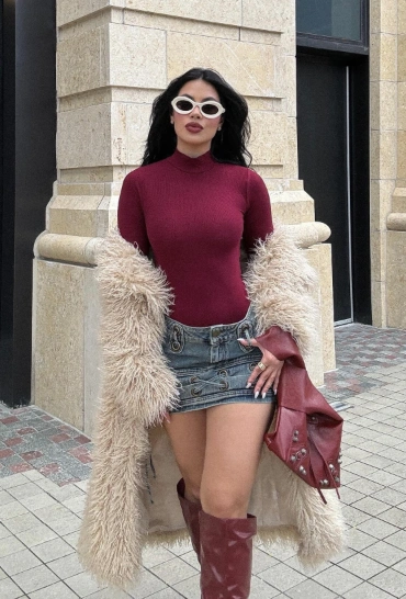 This outfit screams cozy luxury! The maroon ribbed turtleneck sweater pairs perfectly with the denim mini skirt, giving off effortless fall-to-winter vibes. The beige faux fur coat adds that plush, high-end feel, and those burgundy knee-high boots? Chef’s kiss. Add a matching crossbody bag and you’ve got a complete chic winter outfit ready for any occasion.