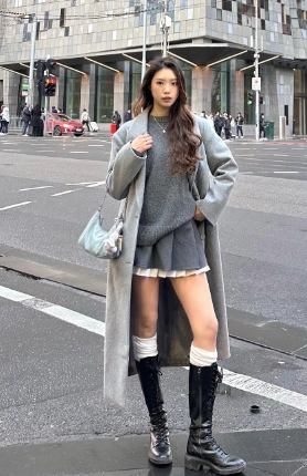 This look is equal parts edgy and cute. The grey oversized coat and chunky knit sweater make a perfect warm duo, while the black mini skirt keeps it flirty. Add knee-high combat boots and white socks peeking out for that effortlessly cool street style winter look. It’s cozy, confident, and totally Insta-worthy.