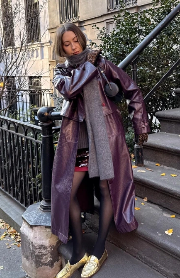If you’re into sophisticated winter outfit ideas, this one’s a gem. The burgundy leather coat adds instant polish, while the grey knit sweater keeps things cozy. The black denim skirt brings a casual twist, and those gold loafers? Pure glam. It’s that perfect mix of comfort, color, and class.