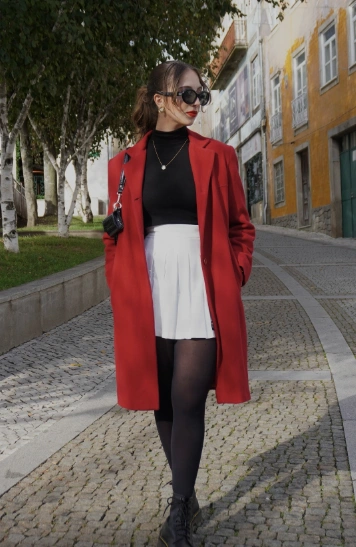 This look is winter perfection! The bold red overcoat instantly steals the spotlight, while the crisp white pleated skirt keeps things classy. The black turtleneck and tights not only keep you warm but also add that sleek, put-together vibe. Pair it with ankle boots, and you’ve got a chic winter outfit that’s perfect for both day and night.