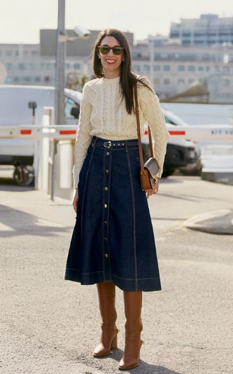 This outfit feels like a cozy hug with a side of sophistication. The cream cable knit sweater adds texture and warmth, making it perfect for chilly days. The denim button-up long skirt gives a timeless, vintage-inspired vibe that’s so easy to dress up or down. And those brown knee-high heeled boots? Total power move — stylish, functional, and perfect for adding height while keeping you comfortable. A must-try for anyone who loves casual-chic winter fashion.