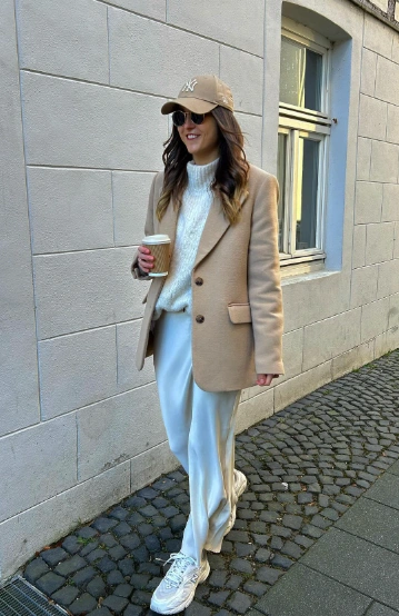 Now this is soft girl winter aesthetic done right! The white satin skirt gives a touch of elegance, balanced by a cream knit sweater for cozy comfort. The beige oversized blazer makes the whole outfit look polished, while the chunky sneakers and baseball cap keep it chill and wearable. A perfect look for casual winter fashion lovers who love comfort with style.