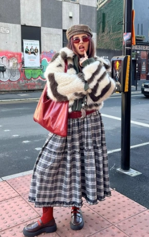 This outfit is all about bold textures and winter chic. The plaid maxi skirt mixed with a striped faux fur coat creates such a statement look. The chunky platform boots give you extra height (and comfort), while the red tote adds a pop of color. It’s the perfect mix of cozy and glam — ideal for cold-weather fashion lovers.