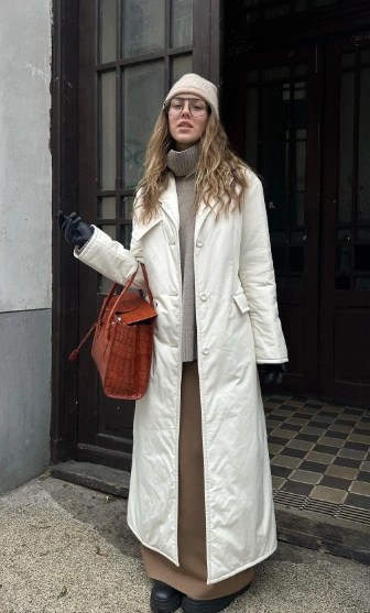 Talk about cozy winter elegance! The white long coat looks super classy over a soft knit sweater and a flowing maxi skirt. Those black boots pull the whole outfit together with a polished touch. And that brown tote bag? It’s giving “effortlessly stylish.” Perfect for brunch dates or winter strolls.