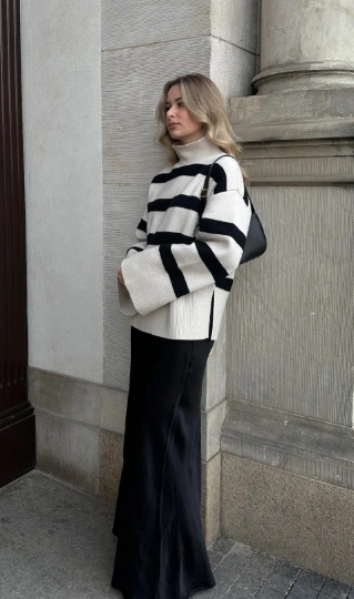 If you’re into minimalist winter outfit ideas, this one’s for you. The striped turtleneck sweater feels like a cozy hug, and the black maxi skirt adds graceful movement. The crossbody bag keeps it practical, and those stylish ankle boots make it winter-ready. Simple, chic, and totally “Pinterest girl” approved.
