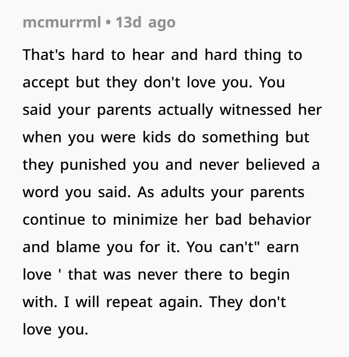 As an adult, S’s behavior didn’t improve. In fact, she did some things that I can never forgive. She slept with one of my boyfriends and then lied about it to my friends, making me look like the villain. My parents did nothing to hold her accountable. They never said a word when she mocked me or belittled me. They continued to treat her like the golden child, and I was left feeling like I didn’t matter.