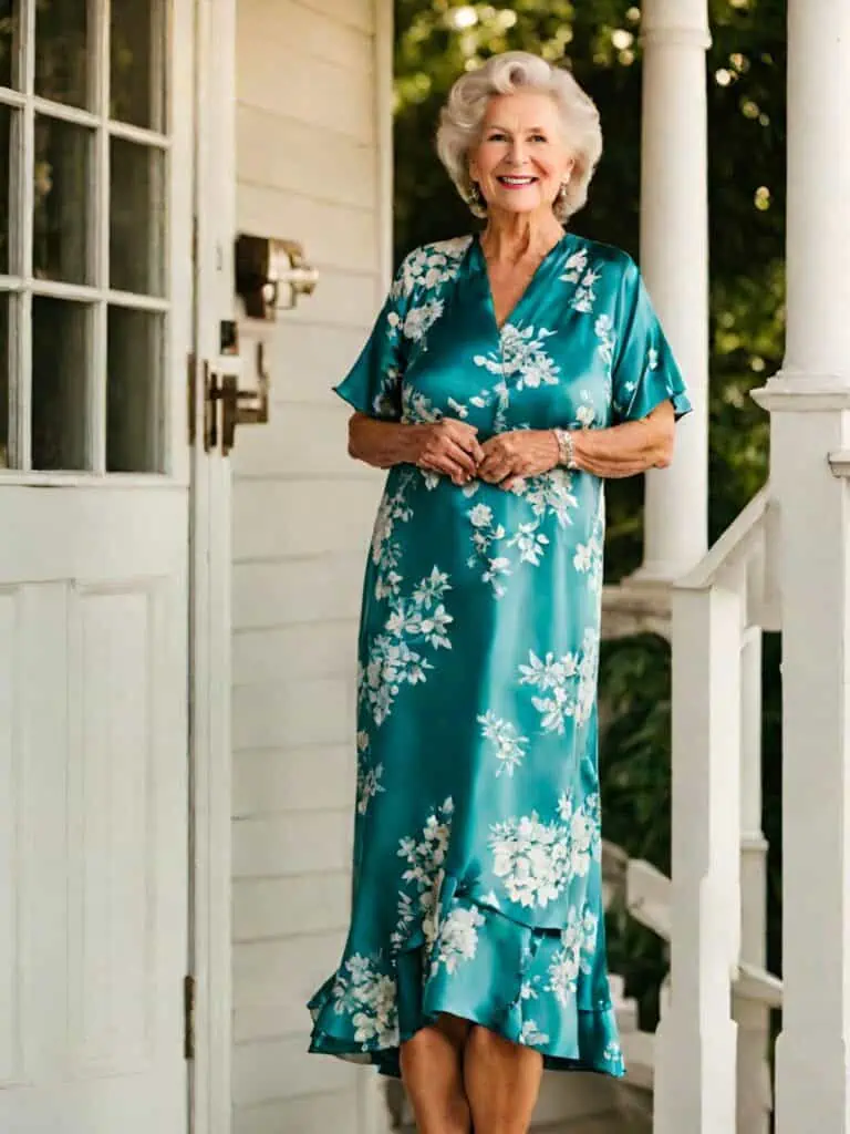 For weddings, parties, or formal dinners, you can’t go wrong with a silk floral dress. Soft silk or satin with floral prints gives you that elegant dress style for older ladies—feminine without being flashy.