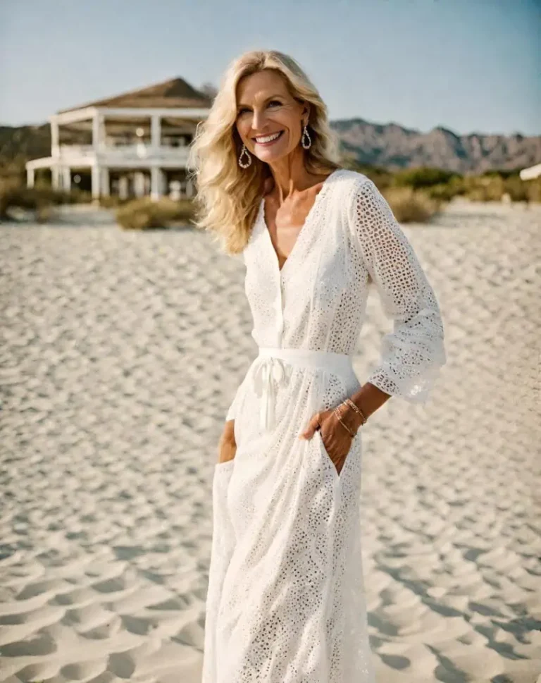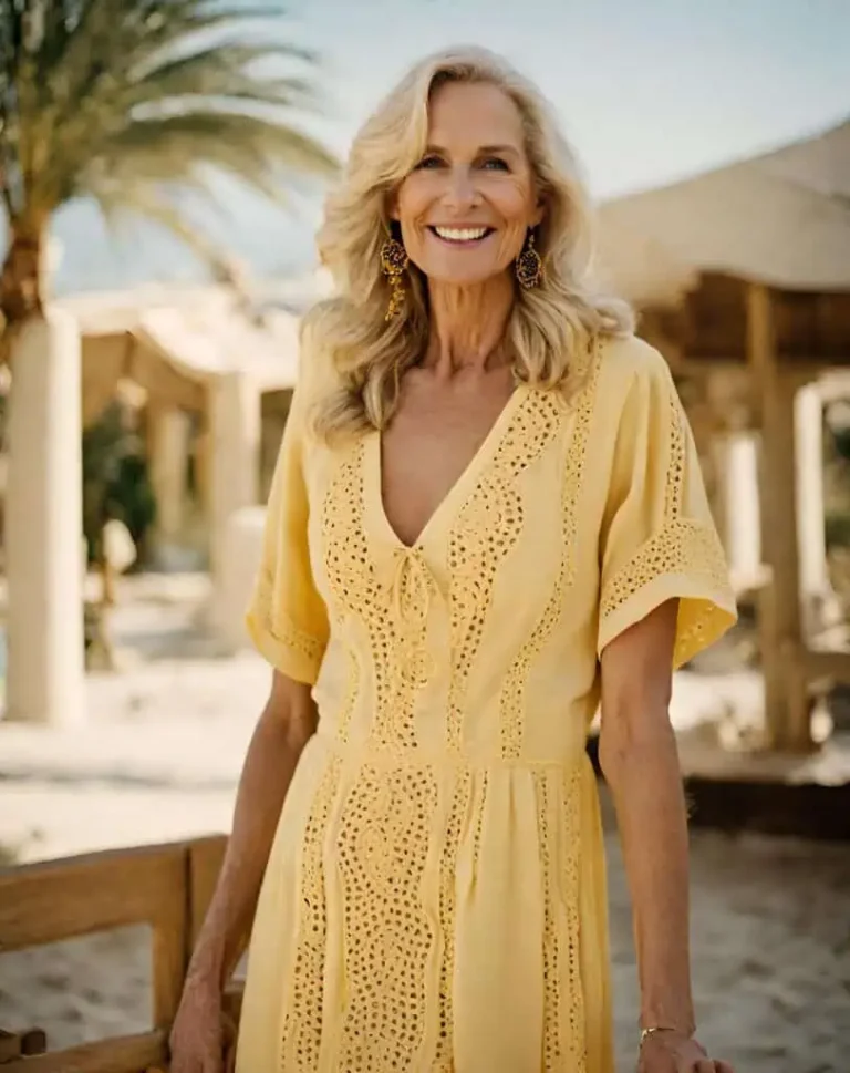 Choose lightweight fabrics like cotton, silk, or linen blends. Go with bright colors for a statement or soft pastels for a relaxed vibe. Add flat sandals and a sunhat, and you’ve got the perfect resort-style dress for seniors.
