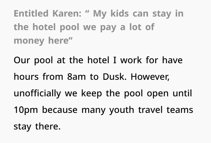 This one’s a textbook “Karen” moment straight out of the hospitality industry. OP works at a hotel and part of the job is managing the pool area. The rule is simple: pool closes at dusk. But to be generous—and keep family vacations fun—the staff usually stretches that to 10 p.m. with a system of polite, progressive warnings.