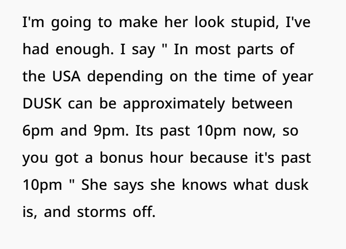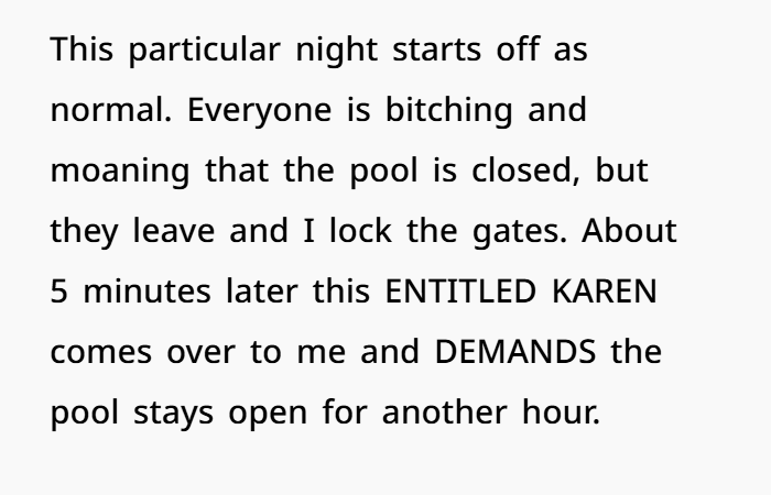 She wasn’t just annoyed about the closure—she demanded the pool stay open later just for her kids. Her argument? “We pay good money to stay here.” She wanted proof of the policy, ignoring the fact that OP already explained the pool had been kept open past the official dusk cutoff.