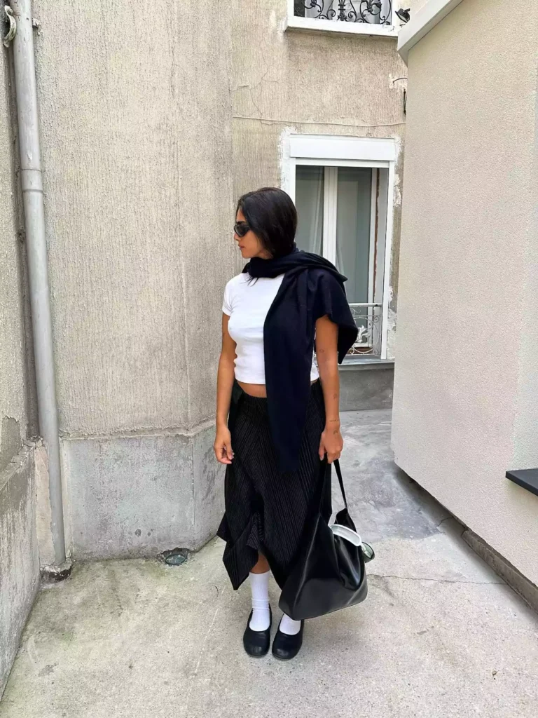 Sometimes simple pieces just need smart styling. A basic tee with a midi skirt instantly feels elevated when you add ballet flats, socks, and a sweatshirt draped over your shoulders. It’s that quiet luxury aesthetic everyone’s talking about.