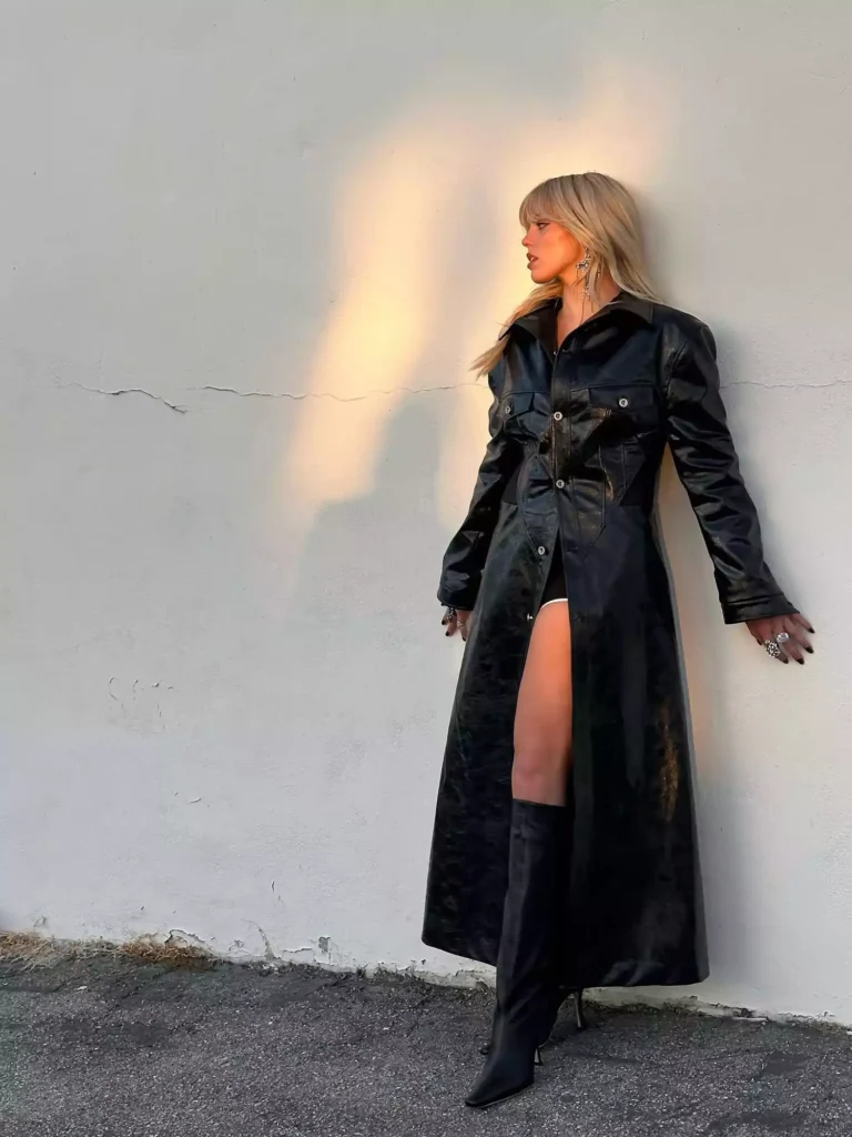 This look plays with structure in the best way. A cropped trench coat styled with a pleated leather maxi skirt feels bold but still polished. It’s that high-fashion street style moment that looks expensive, even if you scored it on a budget fashion find.