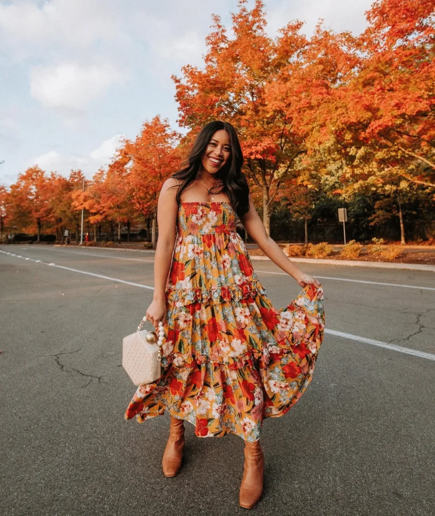 If flowy dresses and earthy color palettes are your thing, this one’s a total fall wardrobe win. A tiered floral maxi dress with sturdy ankle boots gives that effortless boho chic vibe everyone searches for once the leaves start falling. It’s comfy, photogenic, and perfect for pumpkin patch outfits, fall festivals, or weekend coffee walks.