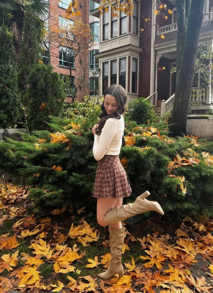 You can’t go wrong with a pleated plaid mini skirt and a soft cream knit sweater. It’s the definition of cozy fall outfits. Feminine, classic, and always trending once back-to-school fashion hits.