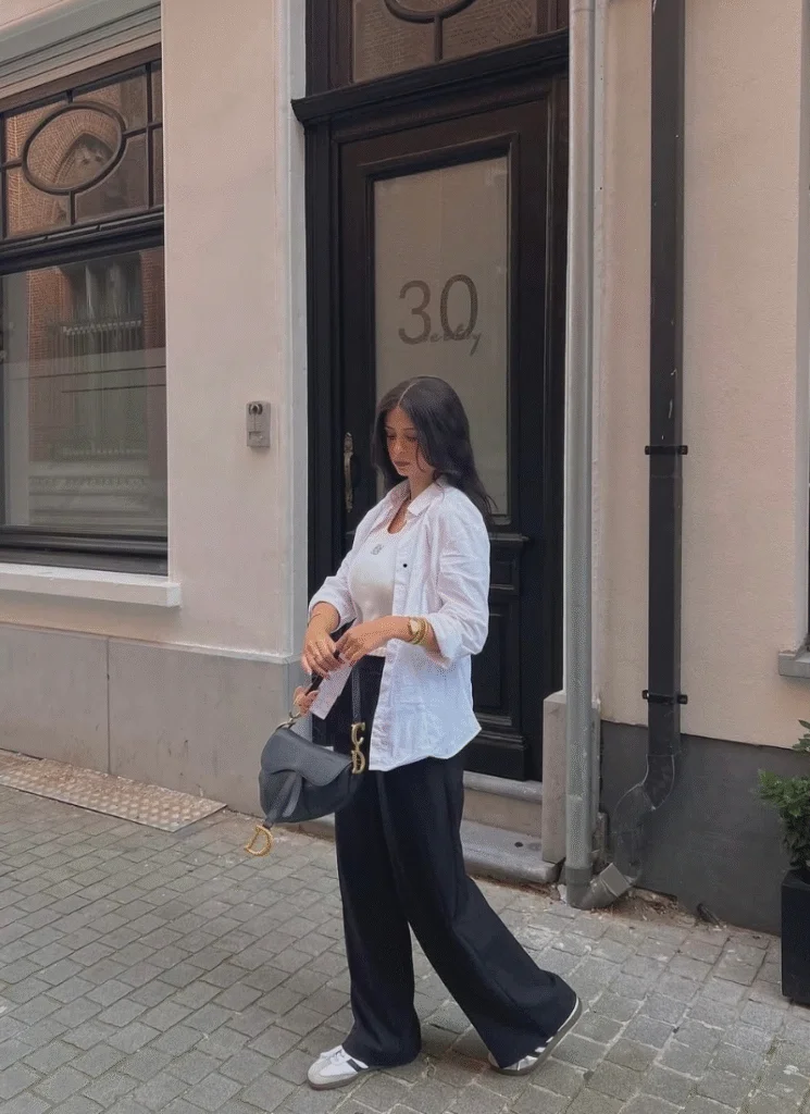 Sometimes simple just wins. Wide-leg black trousers, a crisp white tee, and an oversized button-down shirt create that effortless street style women love. It’s minimal, clean, and super easy to layer.