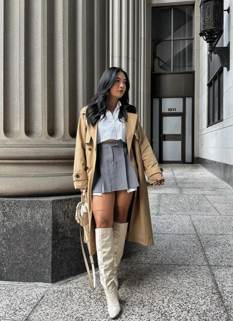 Neutral outfits just hit different in fall. A crisp cropped shirt and pleated mini skirt layered with a long trench coat feels clean, elevated, and very European street style. Add cream boots and the whole look feels expensive.