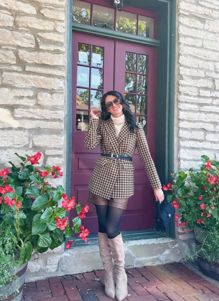 If you wanna look styled without wearing a dress, this is it. A belted gingham blazer with leather shorts gives that high-end fashion vibe while still feeling wearable. It’s structured, bold, and a little editorial in the best way.