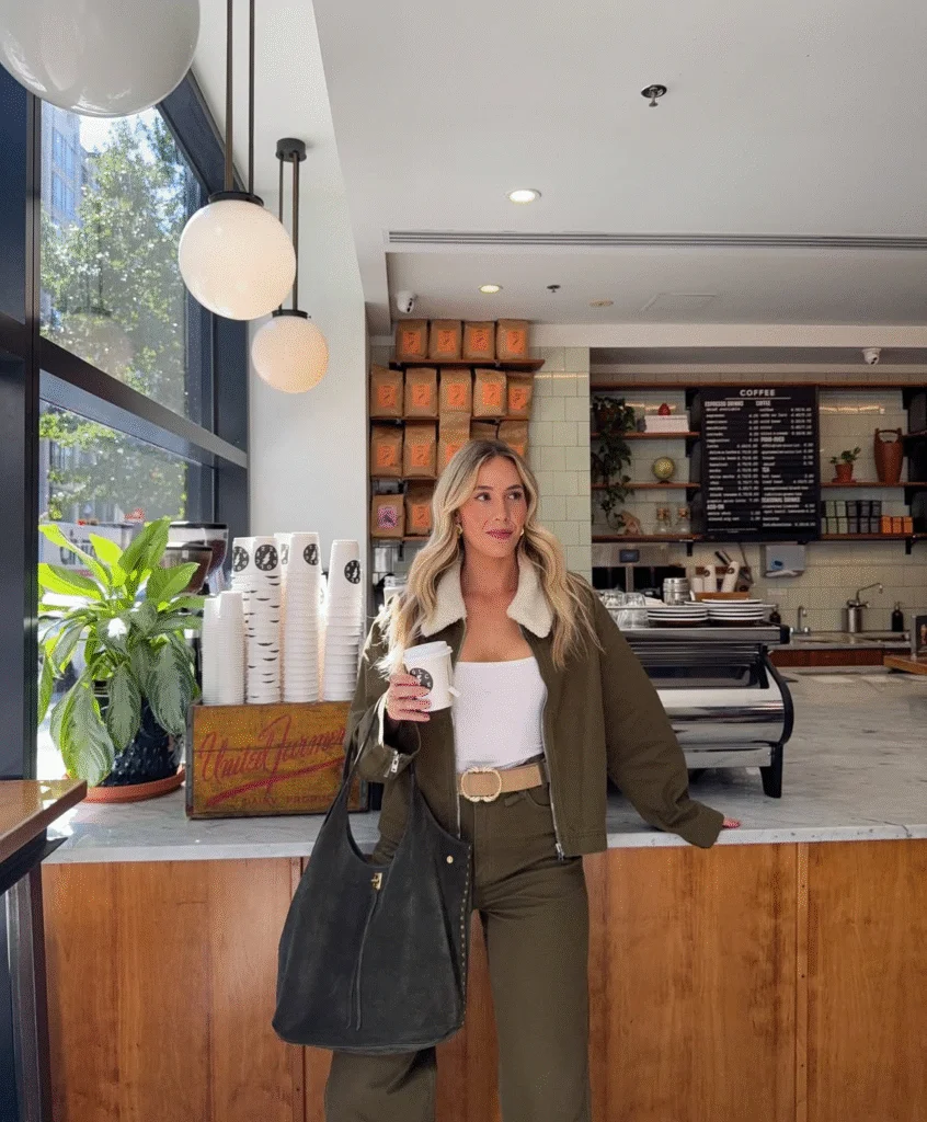 Add a bold statement bag and the whole look pops. It’s perfect for weekend markets, casual city days, or travel outfits. A solid mix of athleisure style and trendy outerwear.