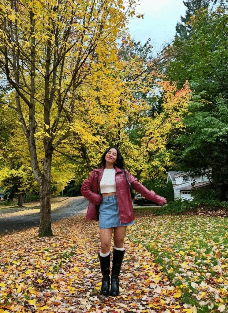 A denim mini skirt with a soft knit sweater and oversized burgundy leather jacket? That’s peak autumn fashion energy. The deep burgundy tone screams fall color trends while still feeling wearable.