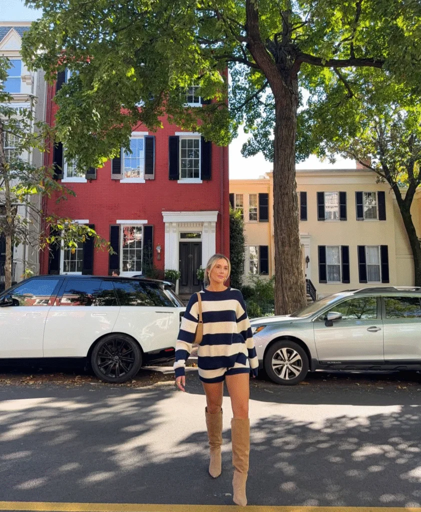 An oversized striped sweater worn as a sweater dress is such an easy fall fashion staple. It’s cozy, comfy, and doesn’t need much styling. Just throw it on and go.
