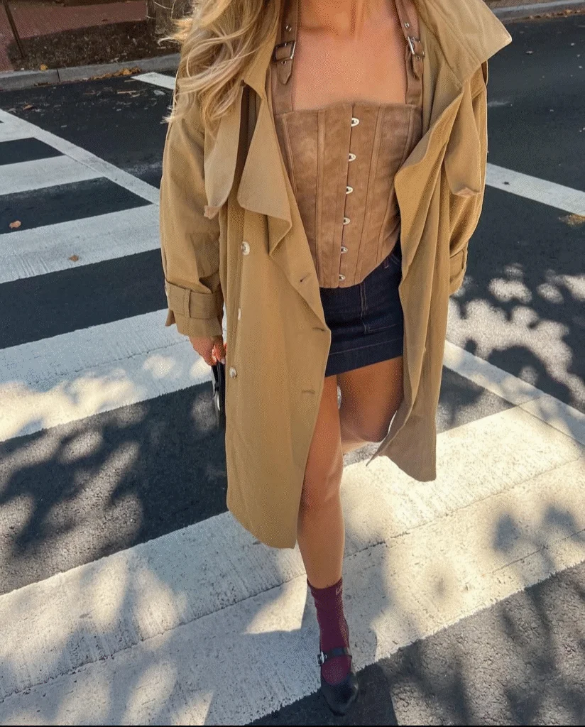 If you love a bold fashion moment, this one’s it. A structured trench coat layered over a suede corset top and denim mini skirt feels confident and very 2026 fashion trends. It’s structured but still playful.