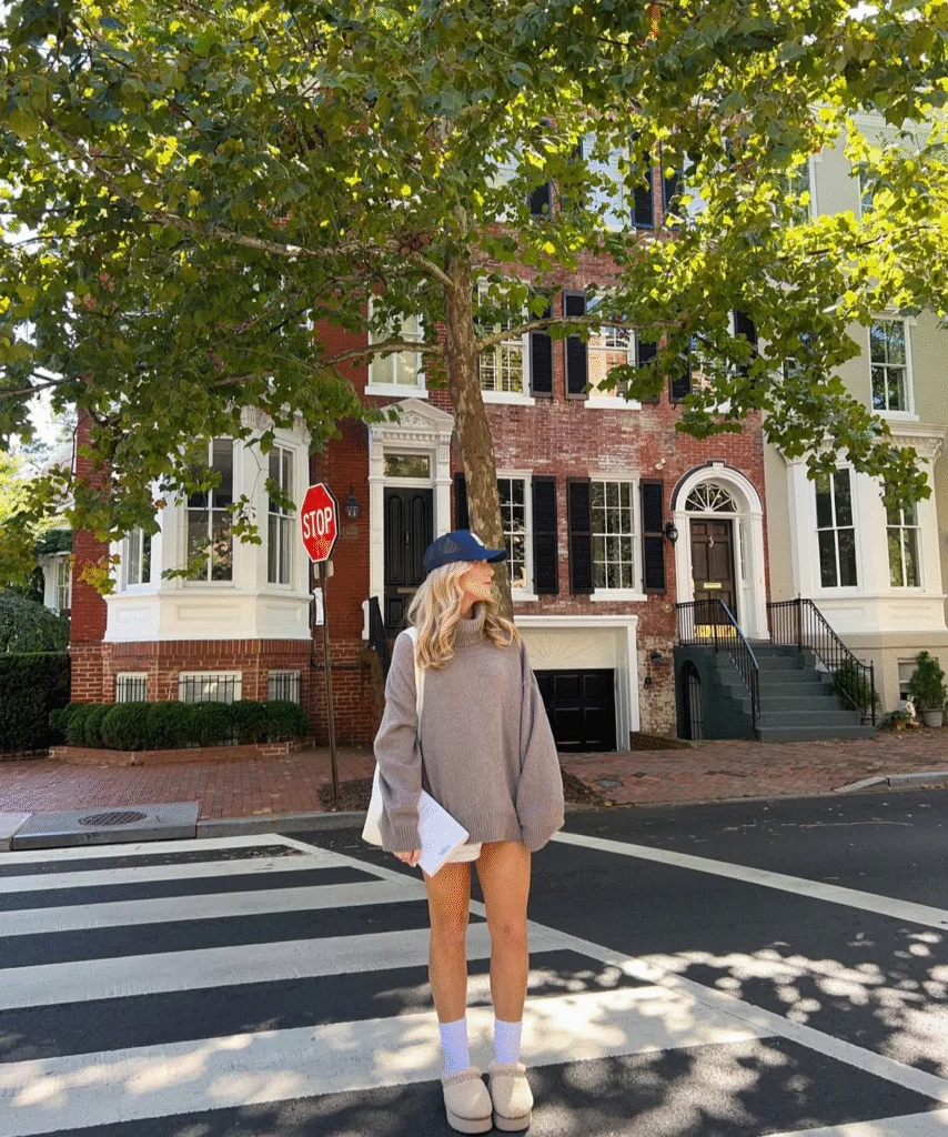This is comfort-first fall fashion done right. An oversized turtleneck sweater with cozy flats or sneakers and a baseball cap feels relaxed but not sloppy. It’s that effortless off-duty model look everyone loves.