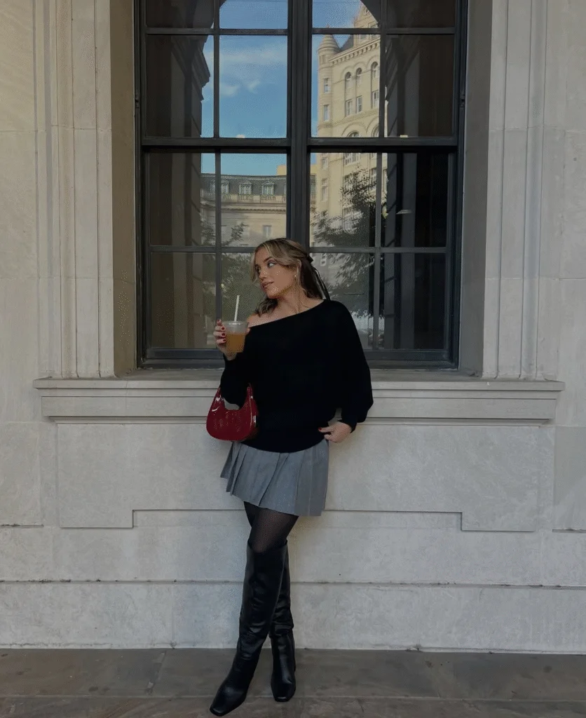 Minimal outfits can still hit hard. A black off-shoulder knit with a grey pleated skirt, tights, and thigh-high boots feels sleek and powerful. It’s the kind of fall evening outfit that turns heads without loud colors.