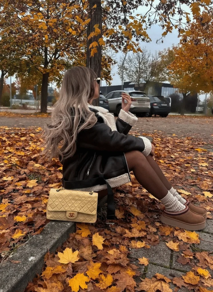 Shearling jackets always come back once the temps drop. Layer one over tights and slip-on boots and you’ve got cozy fall streetwear that actually feels warm. Functional but still stylish.