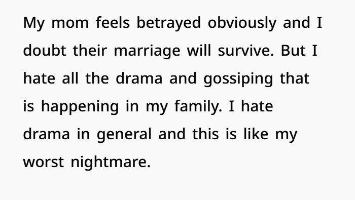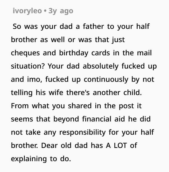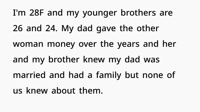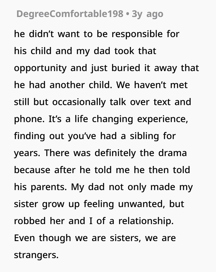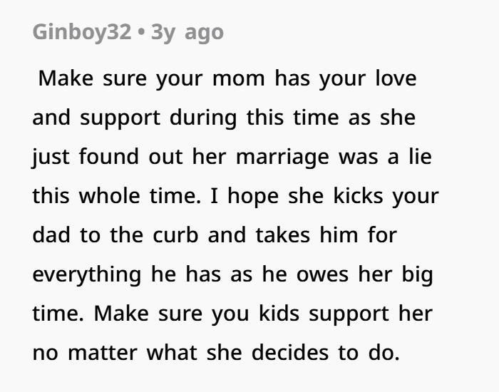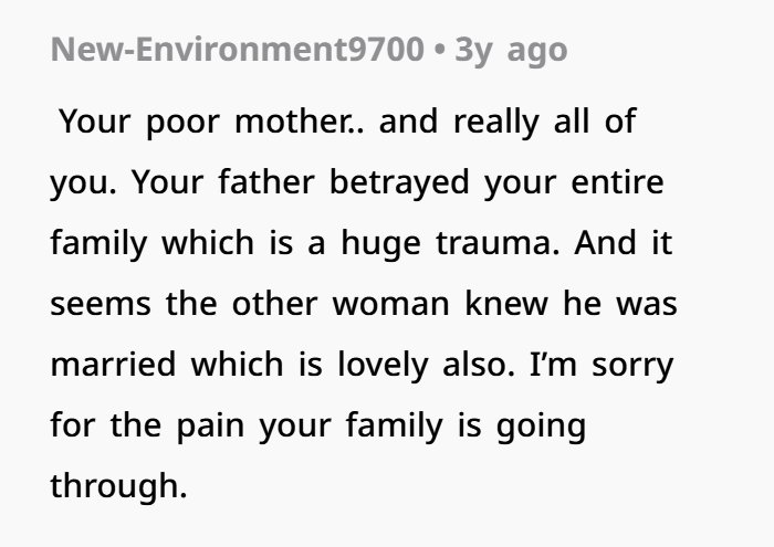 For the rest of the family, including the siblings, the revelation was a crushing blow. For the poster (you), this discovery not only rocked the foundation of your family but destroyed your relationship with your dad. The trust was shattered, and understandably, it has been hard for everyone involved to process the extent of the betrayal. It feels like the rug was pulled out from under you, leaving a sense of confusion and anger that’s hard to move past.