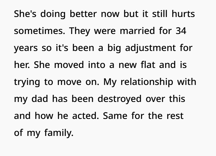 Unsurprisingly, the impact on the marriage was irreparable. The mother couldn’t get past the betrayal, and after a lot of pain and soul-searching, she divorced her husband. After 34 years together, the relationship fell apart, and she’s now starting over in a new apartment, trying to rebuild her life. It’s heartbreaking to think that after all those years, the trust was broken, and the woman had to walk away from a marriage she thought was built on love and loyalty.