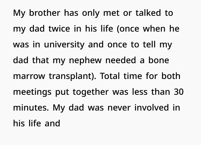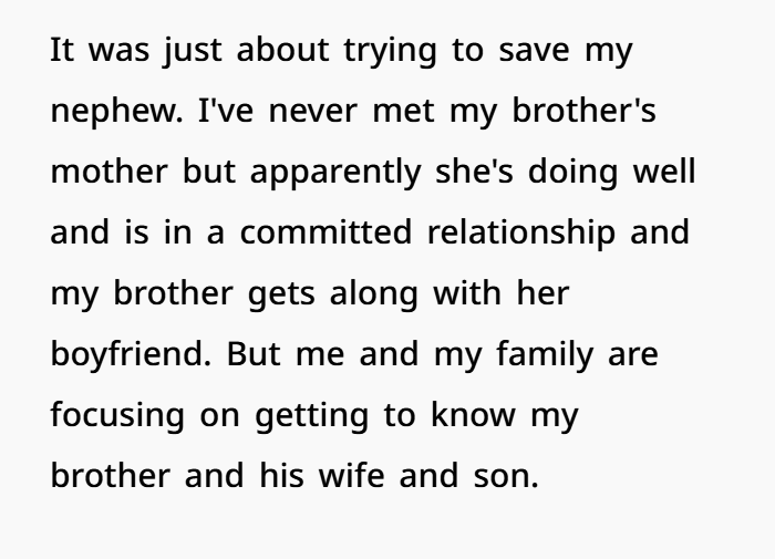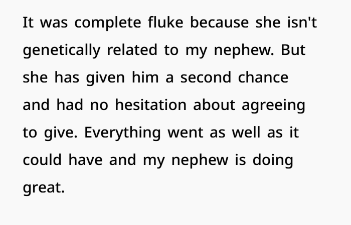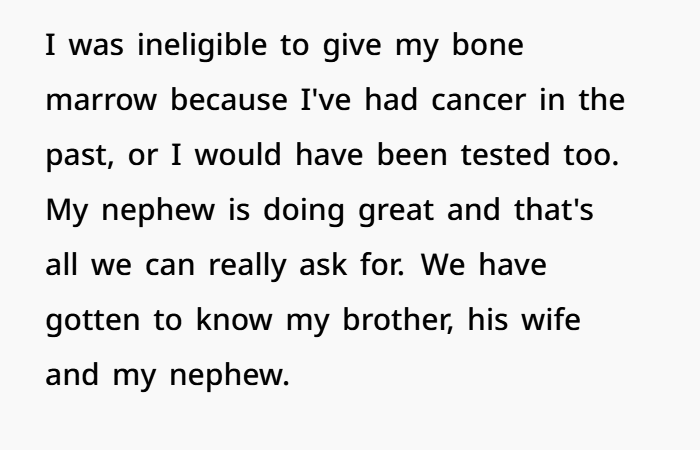 A total stranger, the girlfriend (now fiancée) of the poster’s cousin, turned out to be the perfect match. She wasn’t even genetically related to the nephew but agreed without hesitation to donate her bone marrow. The surgery was a success, and the nephew is now recovering well. In a weird twist of fate, what started as a horrible secret led to a life-saving moment, proving that sometimes, people outside of blood ties can show more kindness and commitment than family members.