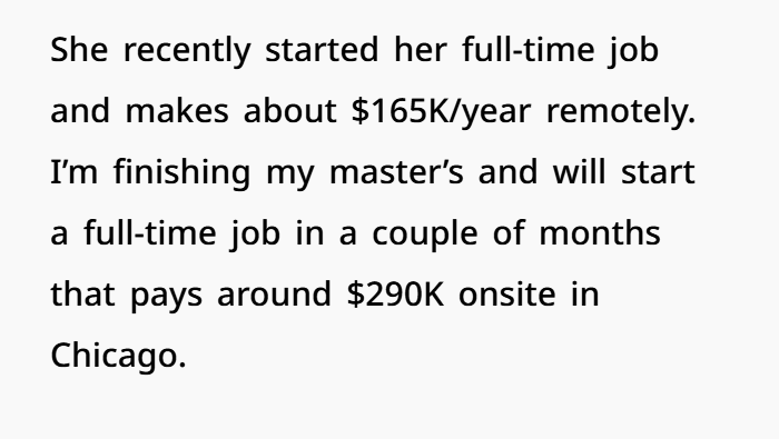 Money and relationships rarely stay simple, and this story is a perfect example of how financial expectations can quietly turn into emotional tension. A 24-year-old guy finishing his master’s degree is preparing to start a high-paying $290K job in Chicago. His girlfriend, 22, already earns around $165K working remotely. Their relationship has been strong for over two years, and he even offered to fully cover rent for a two-bedroom apartment if they moved in together. But she declined, saying her parents wouldn’t approve of living together before marriage. Instead, she plans to move to Chicago separately and now expects him to split her rent as compensation for choosing Chicago over California, where she could earn an extra housing bonus. He’s not worried about the money itself — he’ll be earning more soon — but the principle bothers him. To him, paying rent for a place he doesn’t live in feels strange, especially when she’s financially secure. Now he’s trying to figure out whether this is a fair compromise, a misunderstanding about relationship roles, or the start of a deeper issue around relationship finances, financial boundaries, and modern dating expectations.