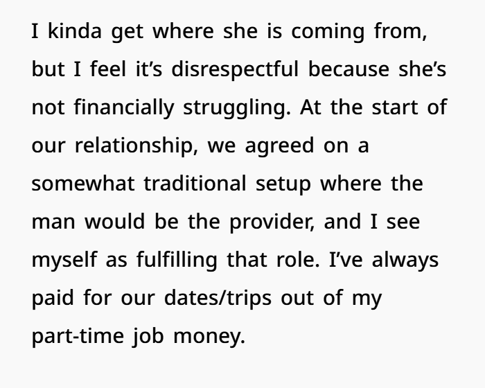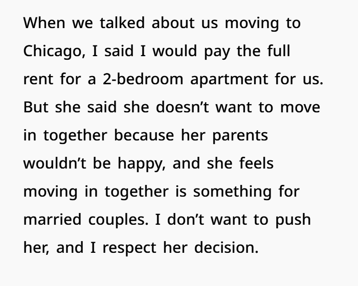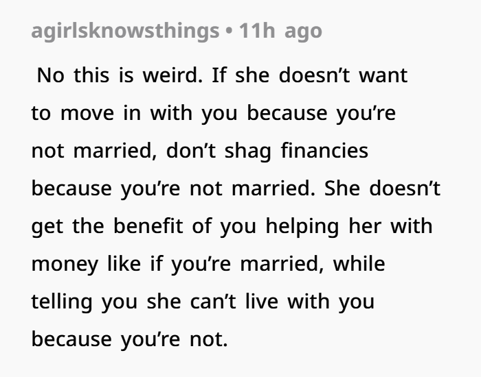 He already offered what many would consider a generous solution: living together with him covering the full rent. That offer aligns with the “traditional provider role” he mentioned. But she rejected that option because of family values around marriage and cohabitation.