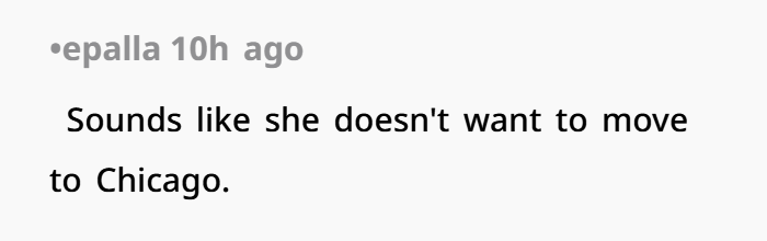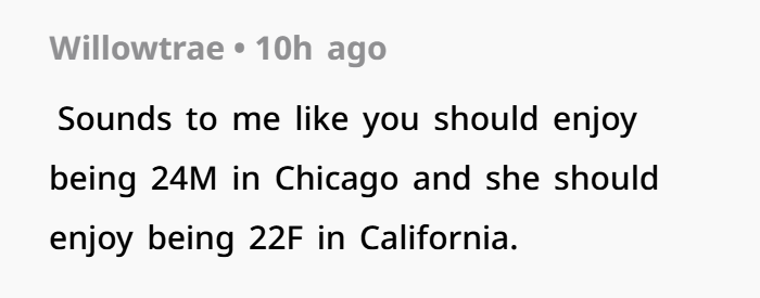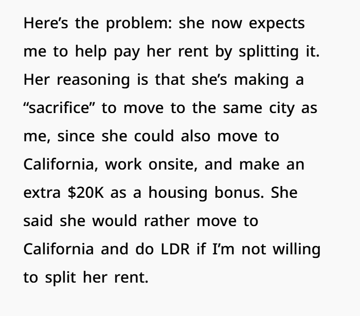 First, look at the girlfriend’s perspective. From her point of view, she believes she’s making a real sacrifice. She has the option to move to California, work onsite, and get roughly a $20K housing bonus. Instead she’s choosing Chicago to stay close to her partner. In her mind, that decision carries a financial cost. Asking him to split rent might feel like a reasonable compromise, almost like sharing the burden of that choice.