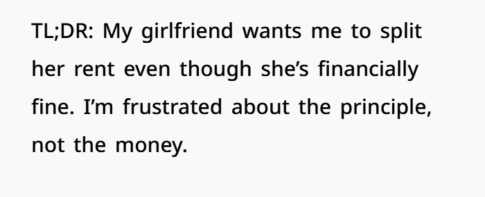 And honestly, there’s also a chance this whole issue is simply a misunderstanding of intentions. She might view rent splitting as symbolic partnership. He views it as illogical financial support.