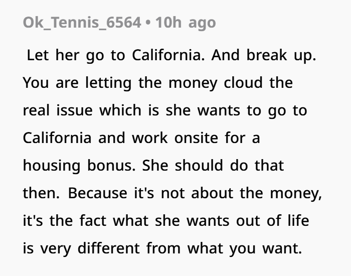 Another practical approach many couples financial advisors recommend is reframing the situation. Instead of rent splitting, they could create a shared travel or relationship fund. If she’s moving cities partly for the relationship, he could contribute to visits, experiences, or shared costs instead of directly paying her housing.