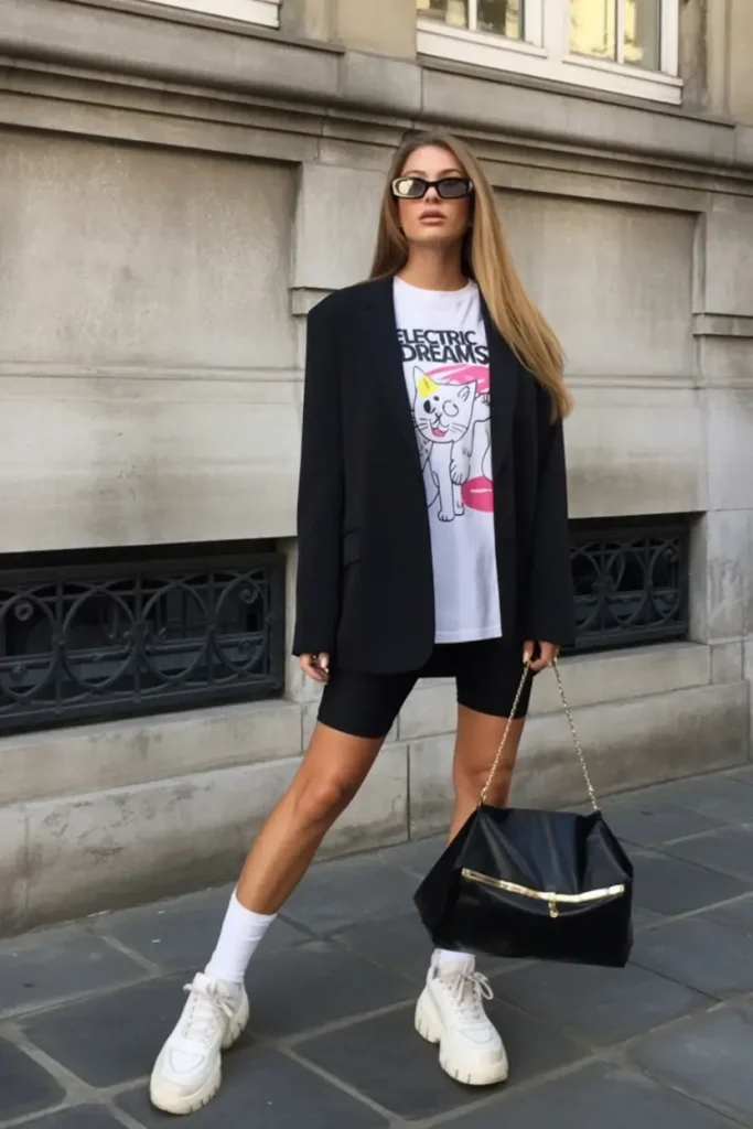 This one blends athleisure and high-fashion streetwear in the best way. Start with an oversized graphic tee featuring a pop-art print, tucked into classic black biker shorts. Throw on a structured black blazer for instant sport-luxe vibes.