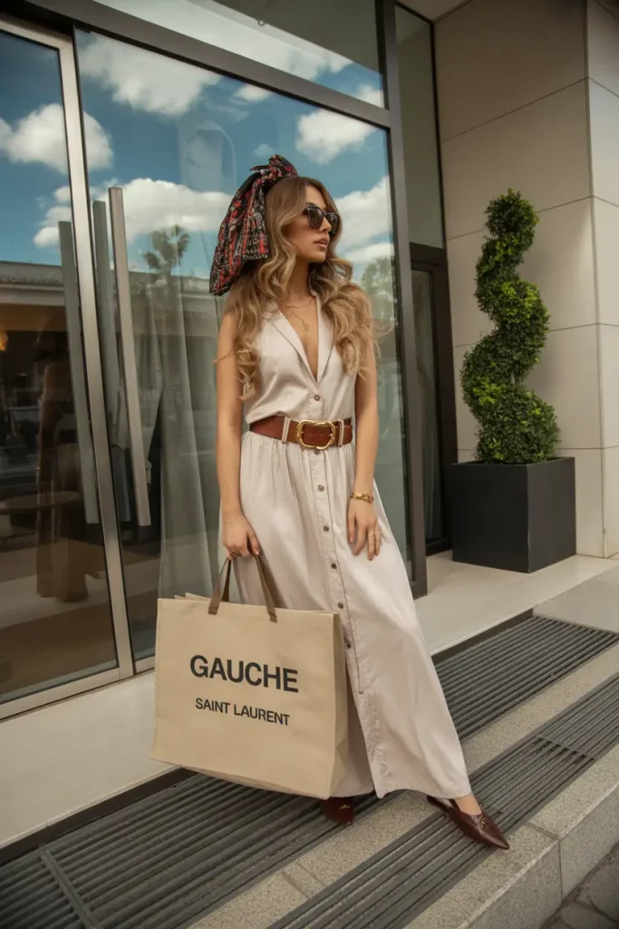 This one’s pure French-girl summer fashion with just the right amount of drama. A sleeveless button-down maxi dress in soft neutral tones makes the base, cinched at the waist with a wide brown leather belt for that vintage Parisian outfit vibe.