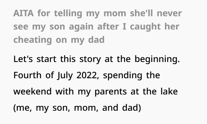 In this emotionally charged story, a woman confronts her mom after discovering she cheated on her dad. Over time, tensions rise, and she makes the tough decision to cut her mom out of her son’s life. The question is—did she cross the line, or was she justified in keeping her son away from someone who broke her trust? The conflict between loyalty, family, and forgiveness takes center stage.
