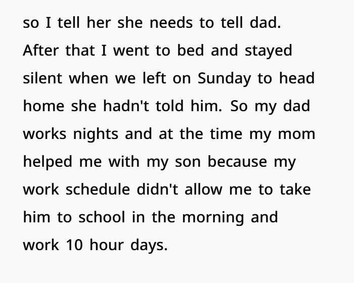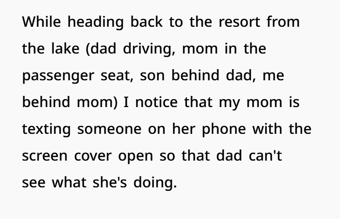 So here’s the situation, and I need some honest feedback. I’m a mom, and I found myself in a really messed-up family situation involving my own mother. To give you some background, this all started in 2022. We were spending the Fourth of July weekend at the lake with my parents—me, my son, my mom, and my dad. Everything was fine until something weird happened in the car on the way back. I noticed my mom texting someone, trying to hide the phone screen from my dad. Normally, I wouldn’t think much of it, but as I kept glancing at her phone, I started to read some of the messages she was sending.