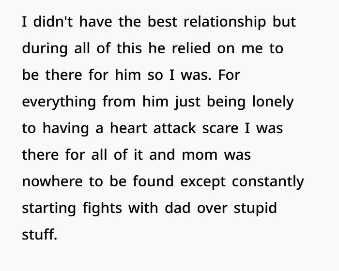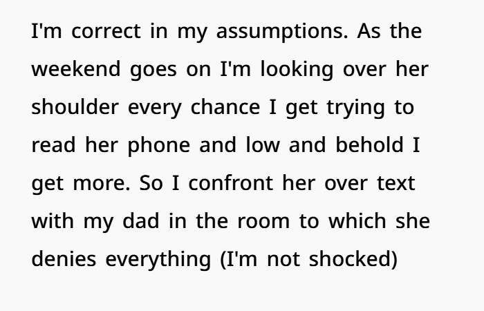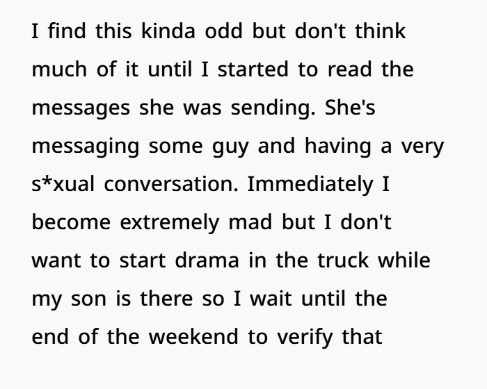 And here’s where it all went downhill: the texts were about some s*xual conversation with another guy. Instantly, I was furious but didn’t want to cause a scene in front of my son. So I waited until later to confront her. After reading more messages, I knew it wasn’t just a one-time thing. So, I texted her—asking her to tell my dad what was going on. Of course, she denied it, and nothing was really addressed when we all left for home.