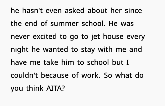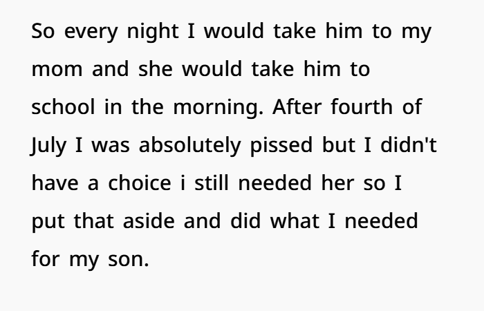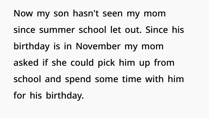 Fast forward to August 2023, I got a work opportunity that changed my life. I switched jobs, moved into the office, and now I’m able to take my son to school and pick him up every day. This is huge because I can finally be the parent I always wanted to be, instead of relying on my mom. Since the summer, my son hadn’t seen my mom at all. He didn’t even ask about her. Then came his birthday in November, and she tried to guilt trip me into letting her spend time with him. She wanted to pick him up from school, but I said no. She never apologized for anything, and instead, she called me childish and said I was hurting my son. But the truth is, my son wasn’t upset at all about not seeing her.